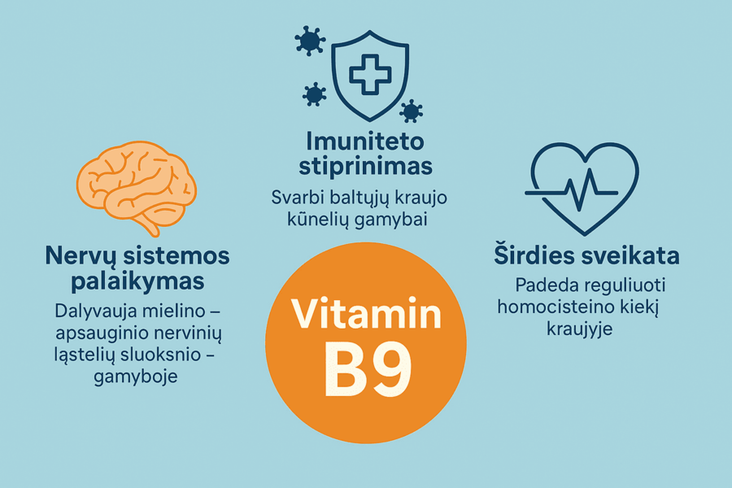 Pagrindinė folio rūgšties funkcija – dalyvavimas nukleorūgščių (DNR ir RNR) sintezėje, kurios būtinos ląstelių dalijimuisi ir audinių atsinaujinimui. Ji taip pat svarbi aminorūgščių metabolizmui, ypač homocisteino pavertimui metioninu, o tai tiesiogiai siejasi su širdies ir kraujagyslių sveikata. Be to, folio rūgštis kartu su vitaminu B12 ir geležimi užtikrina tinkamą raudonųjų kraujo kūnelių gamybą, padeda išvengti megaloblastinės anemijos ir palaiko normalų energijos lygį. Bet tai dar ne viskas.